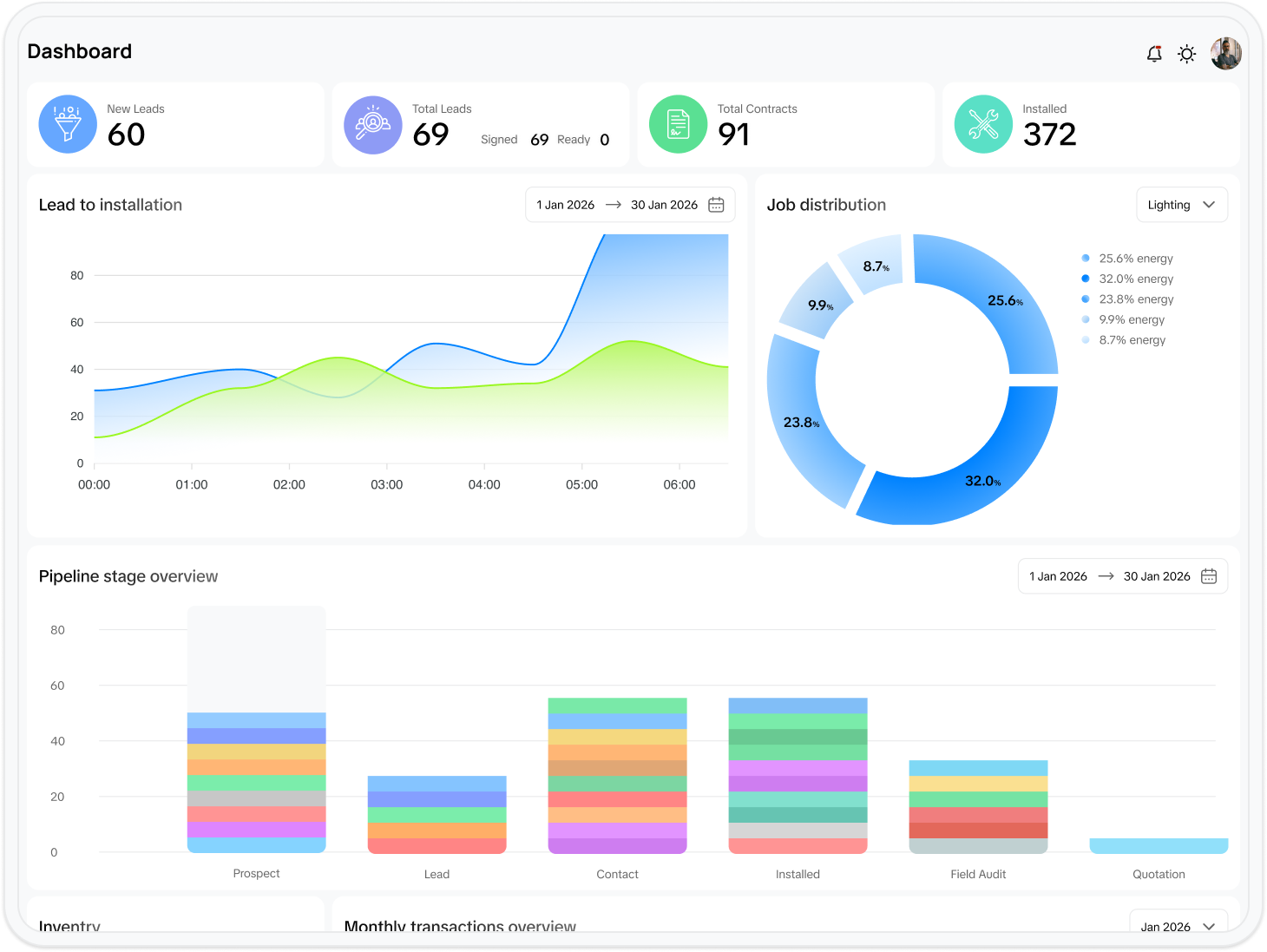 Our CRM is deliberately built to offer you seamless navigation for all important aspects related to your renewable energy business.